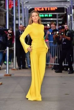 Blake in this sunshine yellow outfit is exactly the color she needs to be wearing. The shade is very warm and very bright. The golden tones in her hair and skin are far more visible and vibrant. Pure yellow can sometimes be a difficult color to wear, but not for those who reside in the spring color palette.