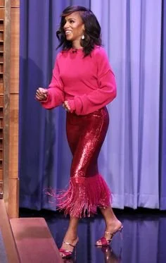 Kerry Washington is absolutely stunning in this fuchsia sweater and skirt. The colors complement her skin tone as a spring well because it is simultaneously bright and warm. The color is making her skin glow rather than pale and lifeless.